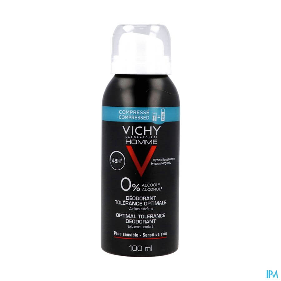 Le déodorant Vichy Homme 48h Tolérance Optimale est un déodorant en aérosol dans un format comprimé. Sa formule hypoallergénique et minimaliste ne contient pas d'alcool pour une tolérance optimale des peaux sensibles. De plus, le flacon contient 32 % de matériaux d'emballage en moins, ce qui signifie que le flacon de 100 ml de ce déodorant a la même quantité et la même efficacité qu'un spray de 200 ml.